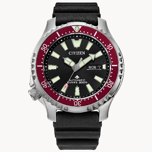 Stainless Steel 44mm Serrated Bezel Case; Automatic Self-winding Movement; Anti-reflective Sapphire Crystal; Black Polyurethane Strap; Red Rotating Bezel; Black Dial with Luminous Hands and Markers; Engraving Caseback of a Pufferfish; ISO Complient; Caliber 8204; Screw-down Crown; Water Resistant 200 Meters from the Promaster Diver Collection NY0156-04E by Citizen Caliber 8204; Screw-down Crown; Water Resistant 200 Meters from the Promaster Diver Collection NY0156-04E by Citizen