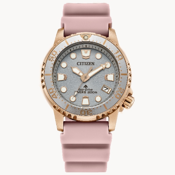Stainless Steel with Rose Gold Finish 36.5mm Serrated Bezel Case; Mineral Crystal; Silver Dial with Large Luminous Hands; Four-O clock Date Window; Soft Pink Polyurethane Strap; Screw-down Crown; Water Resistant 200 Meters from the Promaster Dive Eco Drive Collection EO2023-00A by Citizen Drive Collection EO2023-00A by Citizen