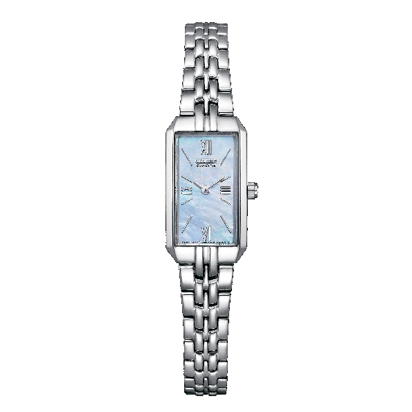 Stainless Steel 14.5mm Rectangle Case; Mother of Pearl Dial; Silver Markers and Hands; Stainless Steel Link Strap with Jewellery Push Button Clasp from the Classic Collection by Citizen Eco-Drive - EG2691-57D