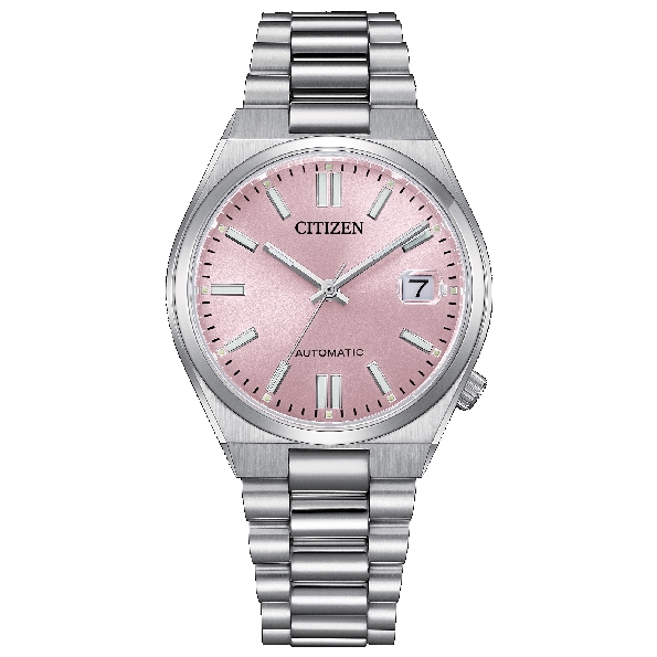 Stainless Steel 37mm Case; 8210 Automatic Movement; Anti-reflective Sapphire Crystal; Sunray Pastel Pink Dial; Magnified Date Window; Silver Markers and Hands from the Tsuyosa Collection NJ0200-50Z by Citizen