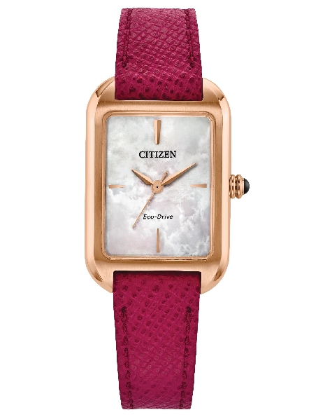 Stainless Steel with Rose Gold Ion Finish 23.5mm Rectangle Case; Mother of Pearl Dial; Spherical Mineral Crystal; Synthetic Sapphire Crown; Textured Pink Leather Strap with from Classic Collection by Citizen Eco-Drive Watch - Style EM1193-08D