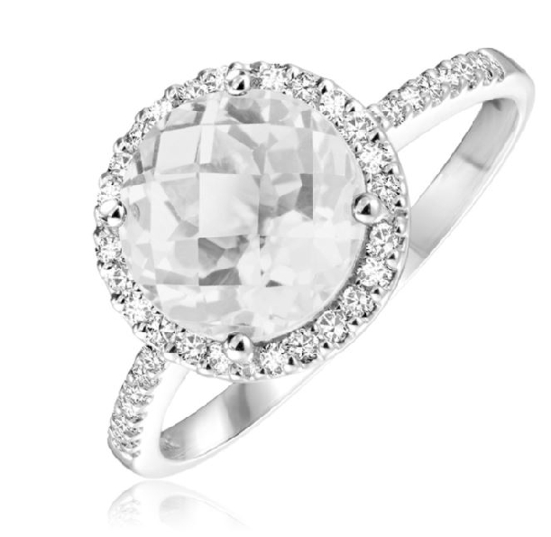 Faceted Round White Topaz 0.14ctw Diamond Halo 14K White Gold Ring - Size 6 1/2