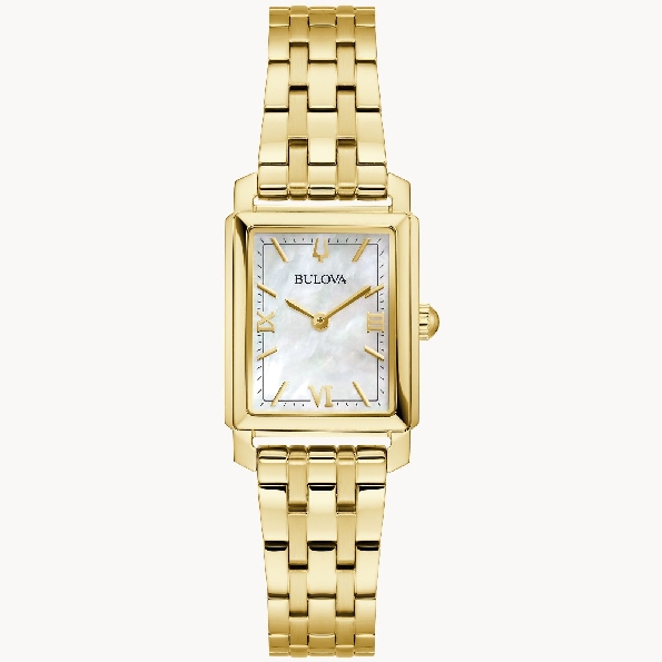 Stainless Steel with Yellow Finish Rectangle Case; Mother-of-Pearl Dial; Yellow Gold Finish Hour Markers and Hands; Yellow Gold Stainless Steel Five-Link Bracelet Strap from the Sutton Collection by Bulova #97L177