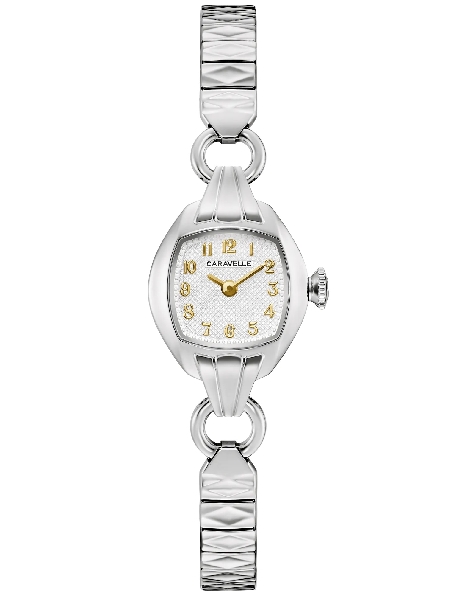 Stainless Steel 19mm Case; Textured Dial with Gold-tone Numbers and Hands; Mineral Crystal; Stainless Steel Textured Expansion Bracelet from the Caravelle Vintage Collection by Bulova Watch - Style 43L225