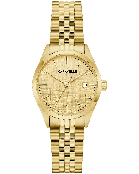 Stainless Steel with Yellow Gold Ion Finish 28mm Round Case; Linen Texture Champagne Dial; Gold-tone Hour Markers; Polished Stainless Steel Yellow Gold Ion Finish Five-Link Bracelet from the Caravelle Classic Collection by Bulova Watch - Style 44M117
