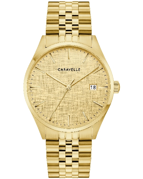 Stainless Steel with Yellow Gold Ion Finish 39mm Round Case; Linen Texture Champagne Dial; Gold-tone Hour Markers; Polished Stainless Steel Five-Link Bracelet from the Caravelle Classic Collection by Bulova Watch - Style 44B132