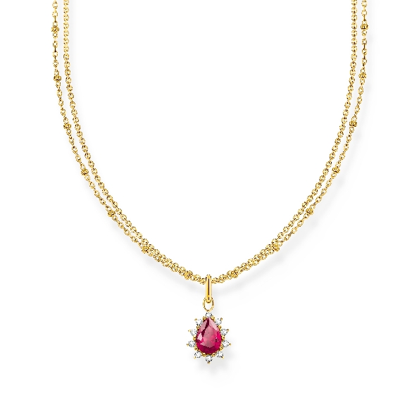 White Cubic Zirconia Halo and Pear Shape Lab Created Red Stone Sterling Silver with 18K Yellow Gold Finish Pendant and Station Bead Double Chain - 15 1/2 - 17 1/2 Inch - True Romance Collection - by Thomas Sabo