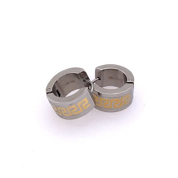 Stainless Steel with Yellow Ion Plated Greek Key Design Satin and Shiny Finish Huggie Earrings by Italgem Steel