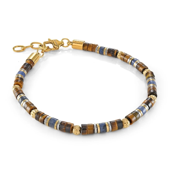 Stainless Steel with Yellow Gold Ion Plating Tigers Eye and Sodalite Bead Bracelet by Italgem Steel - 7 1/2 Inch Adjustable