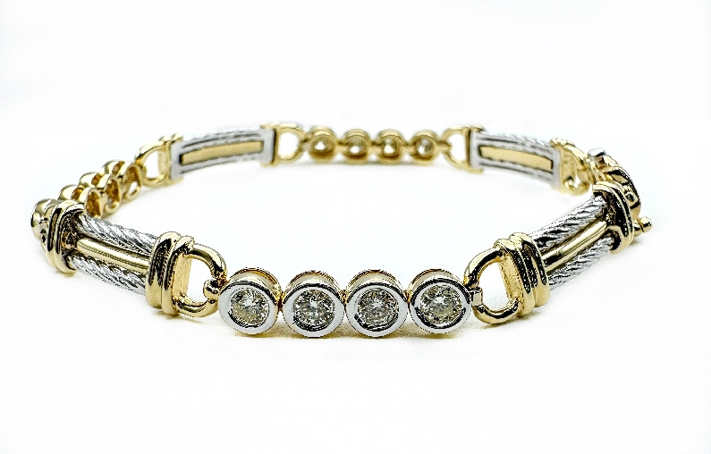 1.42ctw Diamond I1 Clarity; I Colour Bezel Set High Polished and Rope Pattern Link 14K Yellow and White Gold Bracelet - 7 Inch