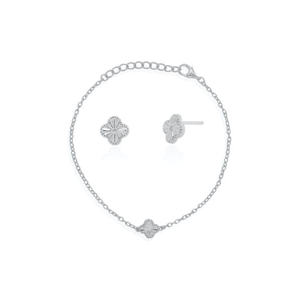 Mini Cubic Zirconia Clover Sterling Silver Yellow Gold Vermeil Stud Earrings and Bracelet Set - 6 1/2 - 7 1/2 Inch