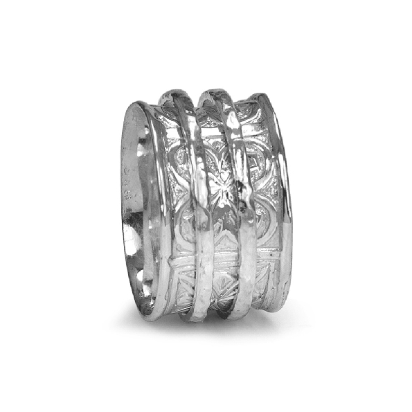 Faith 11mm Wide Sterling Silver Ring with Butterfly and Flower Pattern and Two Thin Textured Spinning Bands from the Silver Serenity Collection by MeditationRings - Size 6