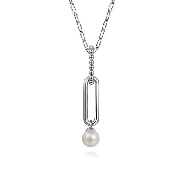 White Fresh Water Pearl with Beaded and Polished Links Sterling Silver Pendant and Chain from the Bujukan Collection by Gabriel & Co. - 17 1/2 Inch - Serial No. S2143460