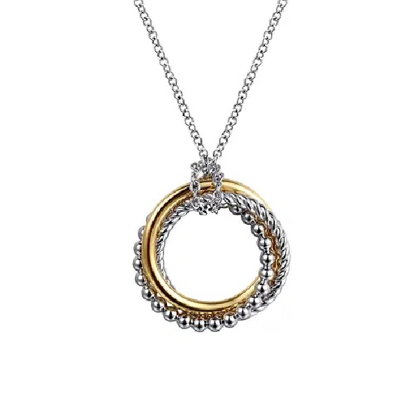 High Polished; Rope and Beaded Multi Circle Sterling Silver and 14K Yellow Gold Pendant and Chain from the Bujukan Collection by Gabriel & Co. - 15 1/2 - 17 1/2 Inch - Serial No. S2143459