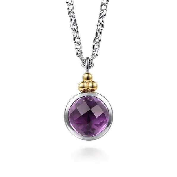 Round Faceted Amethyst with Beaded 14K Yellow Gold Accents Sterling Silver Pendant and Chain from the Bujukan Collection by Gabriel & Co. - 18 Inch - Serial No. S2142920