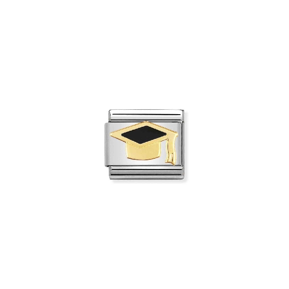 Composable Classic Back to School Black Enamel Graduation Cap Stainless Steel with 18K Yellow Gold Bracelet Link by Nomination Italy