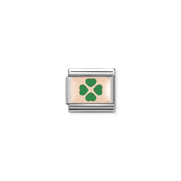 Composable Classic Good Luck Four Leaf Clover with Green Enamel Stainless Steel with 9K Rose Gold Bracelet Link by Nomination Italy