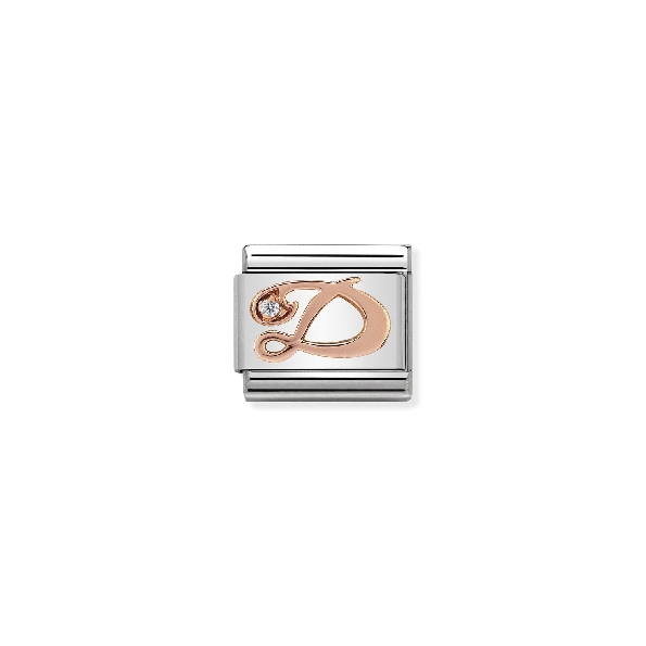 Composable Classic Letters Cubic Zirconia Cursive Initial D Stainless Steel with 9K Rose Gold Bracelet Link by Nomination Italy