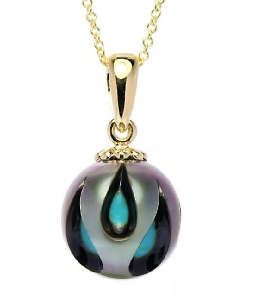 Carved Cultured Pearl with Blue Turquoise and 14K Yellow Gold 18 Inch Necklace by Galatea MSRP: $1,590 SKU: PE27068 Get more info on this Share: Share on Twitter Share on Pinterest Share on Facebook