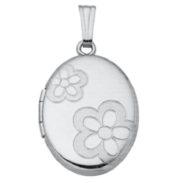 Medium Hand Engraved Polished with Flowers Oval Sterling Silver Locket with Cable Link Chain - 18 Inch - Locket Studio Code: E17S