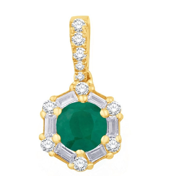 Round Emerald 0.42ct with Round and Baguette Diamond VS2-SI1 Clarity; G Colour Hexagon Halo and Diamond Bail 14K Yellow Gold Pendant
