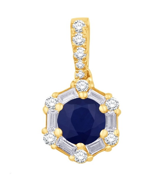 Round Sapphire 0.57ct with Round and Baguette Diamond VS2-SI1 Clarity; G Colour Hexagon Halo and Diamond Bail 14K Yellow Gold Pendant