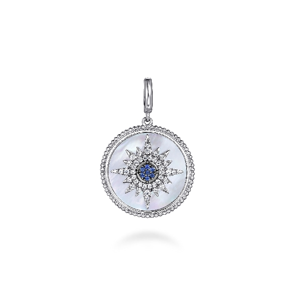 Round Medallion with White and Blue Sapphire Starburst set on Mother of Pearl Inlay Sterling Silver Pendant - from the Bujukan Collection by Gabriel & Co. - Serial No. S2242423