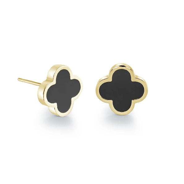 Stainless Steel with Yellow Gold Ion Finish with Black Enamel 10mm Clover Stud Earrings - Veloria by Italgem Steel