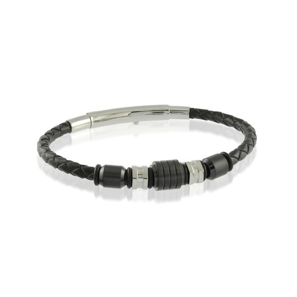 Adjustable Braided Black Leather Bracelet with Black Ion Finish Stainless Steel Accent Beads by Italgem Steel