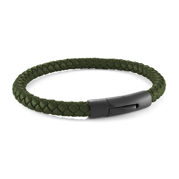 Braided Army Green Leather Bracelet with Matte Black Ion Plated Stainless Steel Push Clasp by Italgem Steel - 8 Inch