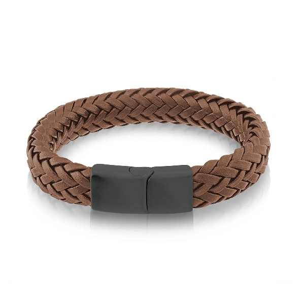 Wide Brown Braided Leather with Stainless Steel Black Ion Plated Sideways Clasp by Italgem Steel - 8 Inch
