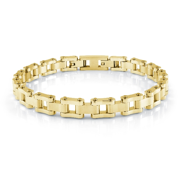Stainless Steel with Yellow Gold Ion Finish Polished with Matte Finish Centre Watch Bike Link Bracelet by Italgem Steel - 9 Inch Adjustable