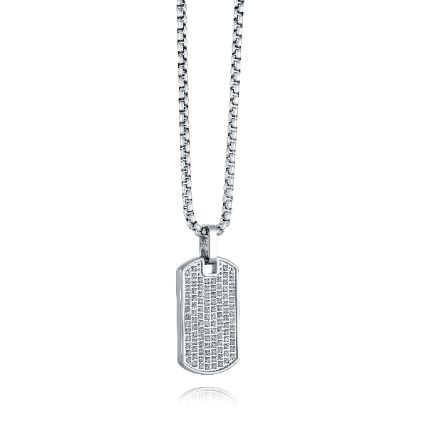 Stainless Steel Pave White Cubic Zirconia Dog Tag Pendant with Round Box Chain by Italgem Steel - 22 Inch