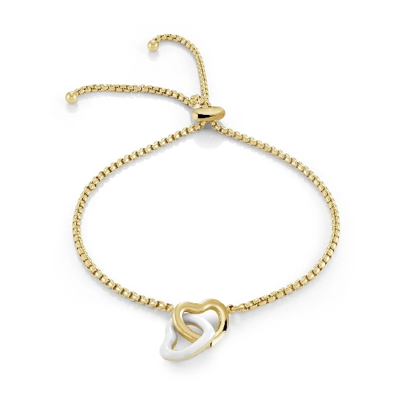 Stainless Steel with Yellow Gold Ion Finish White Enamel Double Puffed Heart Bolo Adjustable Bracelet - Veloria by Italgem Steel