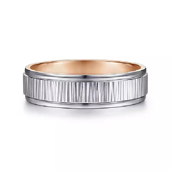 6mm Two-Tone White-Rose Gold Mens Band with Vertical Etching by Gabriel & Co. Price for 14KW/R **Includes Complimentary Titanium Band
