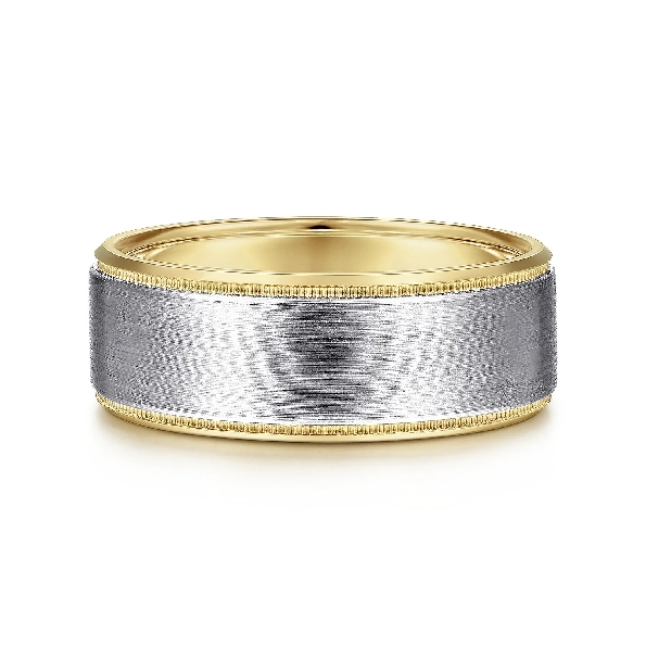 8mm Two-Tone White-Yellow Mens Band in Satin Finish and Polished Edges by Gabriel & Co. Alloy Sample - Price for 14KW/Y **Includes Complimentary Titanium Band